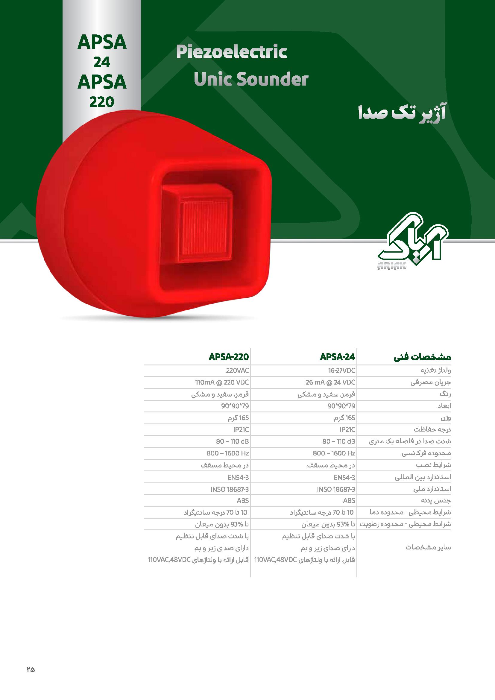 در این آژير از صفحه پيزو الكتريك براي توليد صدا استفاده ميشود. اين صفحه با اعمال يك سيگنال الكتريكي تقويت شده، صدايي در محدوده فركانس شنوايي توليد ميكند. این دستگاه با مركز کنترل اعلام حريق مورد استفاده قرار میگیرد و مطابق با استاندارد ایران وEN54-3 ساخته شده است. با برقراري تغذيه، آژير فعال شده و صدايي با فركانس متغير از 800 Hz تا 16KHz را در فواصل زماني 500msec و تا زمان قطع تغذيه توليد ميكند.