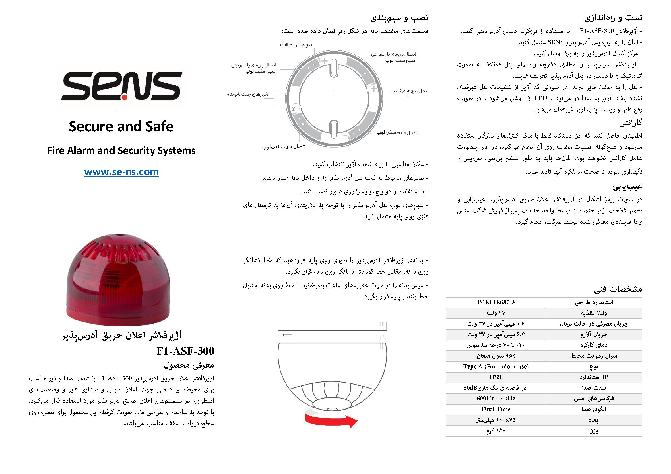 در یک سیستم اعلان حریق بعد از تشخیص حریق، این موضوع باید هرچه سریعتر توسط اعلانهای صوتی و تصویری به اطلاع ساکنین و افراد حاضر در محل رسانده شود از این رو وجود المانهای اعلان صوتی و شنیداری در یک سیستم اعلان حریق ضروری میباشد. آژیرفلاشر آدرسپذیرF۱-ASF-۳۰۰ با شدت صدا و نور مناسب و قابلیت آدرسگیری برای محیطهای داخلی انتخاب مناسبی میباشد.