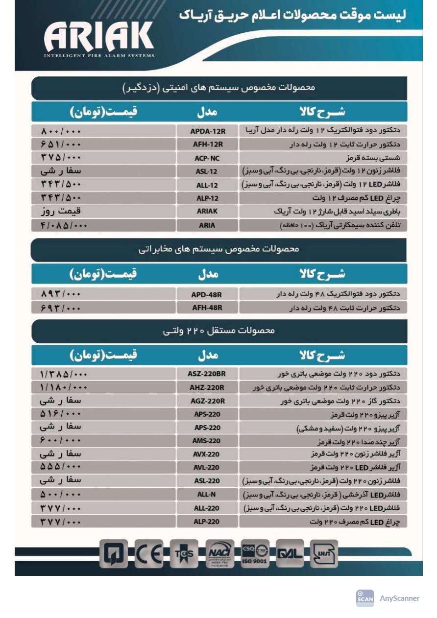لیست قیمت موقت محصولات اعلام حریق آریاک