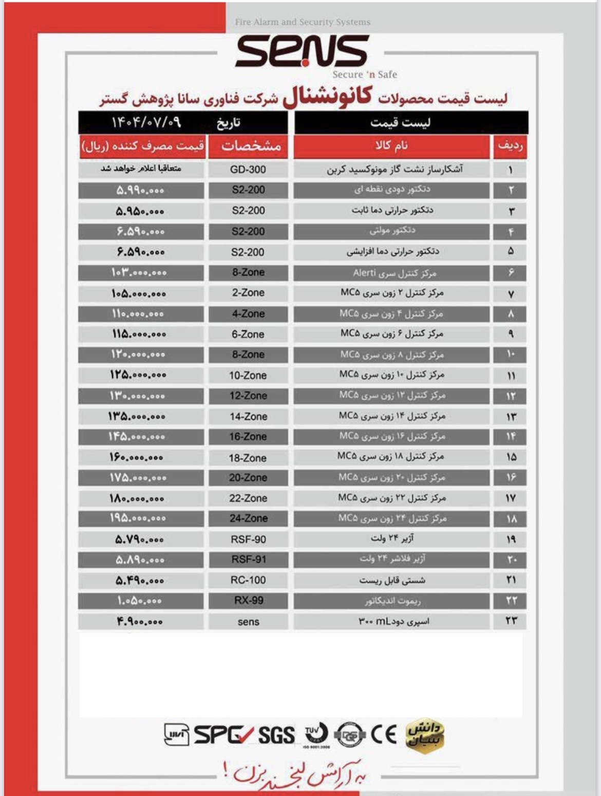 لیست قیمت موقت محصولات اعلام حریق سنس